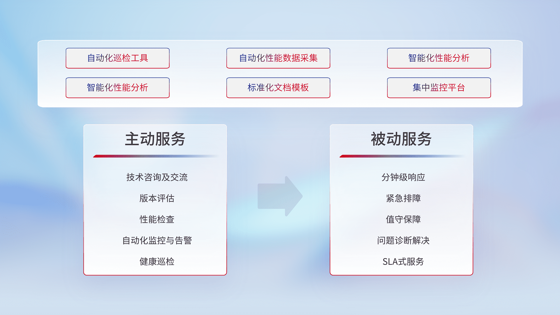 智能化工具和标准化文档,,,,保障服务质量,,,,提供主动服务(包含技术咨询、、、、版本评估、、、、性能检查、、、、自动化监控与告警、、、健康巡检)和被动服务包含(分钟级响应、、、、紧急排障、、值守保障、、、问题诊断解决、、SLA服务)。。